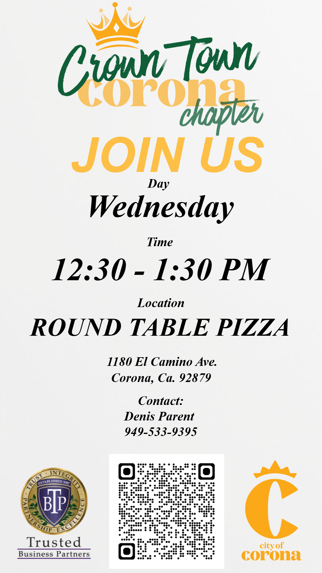 Join us Wednesdays at 12:30PM in Corona at Round Table Pizza 1180 El Camino Ave. Corona, Ca. 92879
